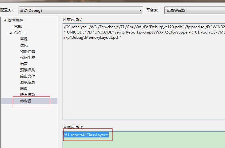 先选择左侧的C/C++->命令行,然后在其他选项这里写上/d1 reportAllClassLayout,它可以看到所有相关类的内存布局,如果写上/d1 reportSingleClassLayoutXXX(XXX为类名),则只会打出指定类XXX的内存布局。近期的VS版本都支持这样配置。