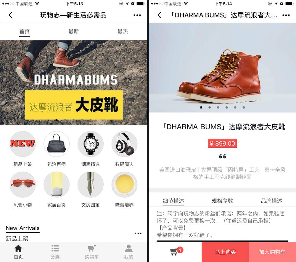 要是你想把那件商品据为己有,在商品详情页下方点击「马上购买」或「加入购物车」,剩下的就不需要我们教了……在玩物志小程序的任一页面,你都能通过底部的导航栏,迅速进入「购物车」页面,以及「我的」个人页面。