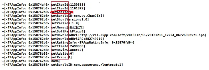 TRAppInfo对应一个App的相关信息,包括下载地址,为了得知这些信息是怎么初始化的。在-[TRAppInfo setAdsite:]下断点: b -[TRAppInfo setAdsite:],然后查看调用堆栈: