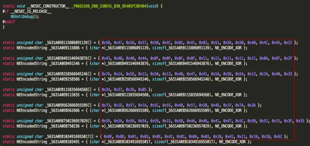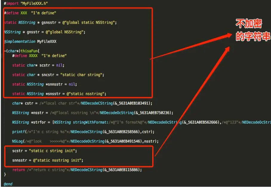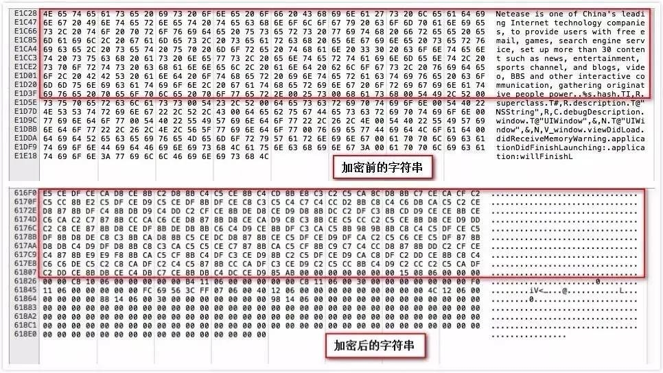 字符串会暴露APP的很多关键信息,攻击者可以根据界面显示的字符串,快速找到相关逻辑的处理函数,从而进行分析破解。加密字符串可以增加攻击者阅读代码的难度以及根据字符串静态搜索的难度。