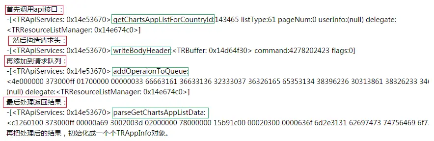 其中的一个类TRApiServices很像是网络请求的接口。Hook该类的调用输出,点击榜单 ,并有了以下log输出: