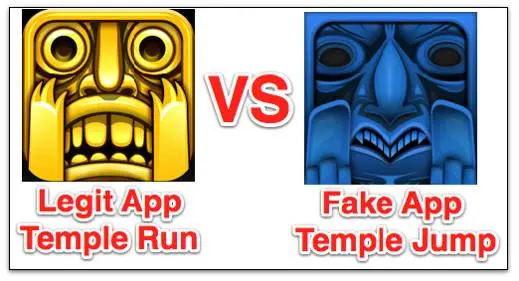 比如上面的《神庙逃亡》应用,左边是合法的,右边是山寨的,山寨的APP就把图标的背景色以及局部做了一些修改,看起来和正品是如此的相似。