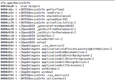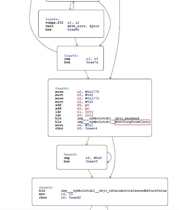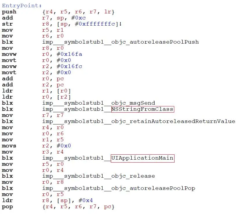 这里主要包含两个API的符号: NSStringFromClass、UIApplicationMain。其余就是一些消息发送以及内存管理的相关符号,但如果进行一定的代码逻辑混淆后,这个结构就会变得大不一样了。