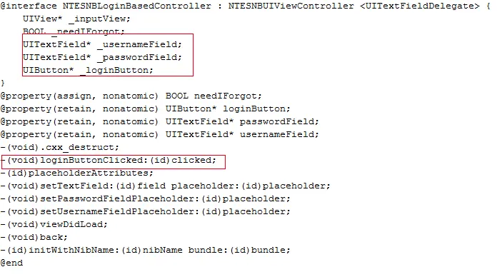 “class-dump NewsBoard”,就可以得到应用的类信息,包括函数名,下面是该APP的一个登陆页面的头文件: