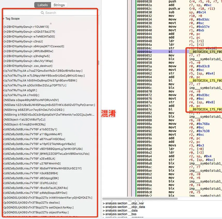 “Labels”栏里,显示的这些符号,不管是类名还是方法名,谁也看不出来到底什么意思,这个函数到底是什么功能,就有点丈二和尚摸不着头脑的感觉,这就大大增加了破解者分析APP的难度。