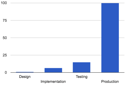 BM System Sciences Institute的研究显示,在生产阶段修复代码的时间,是在设计阶段修复代码时间的100倍以上,是部署阶段修复代码世界的15倍以上。