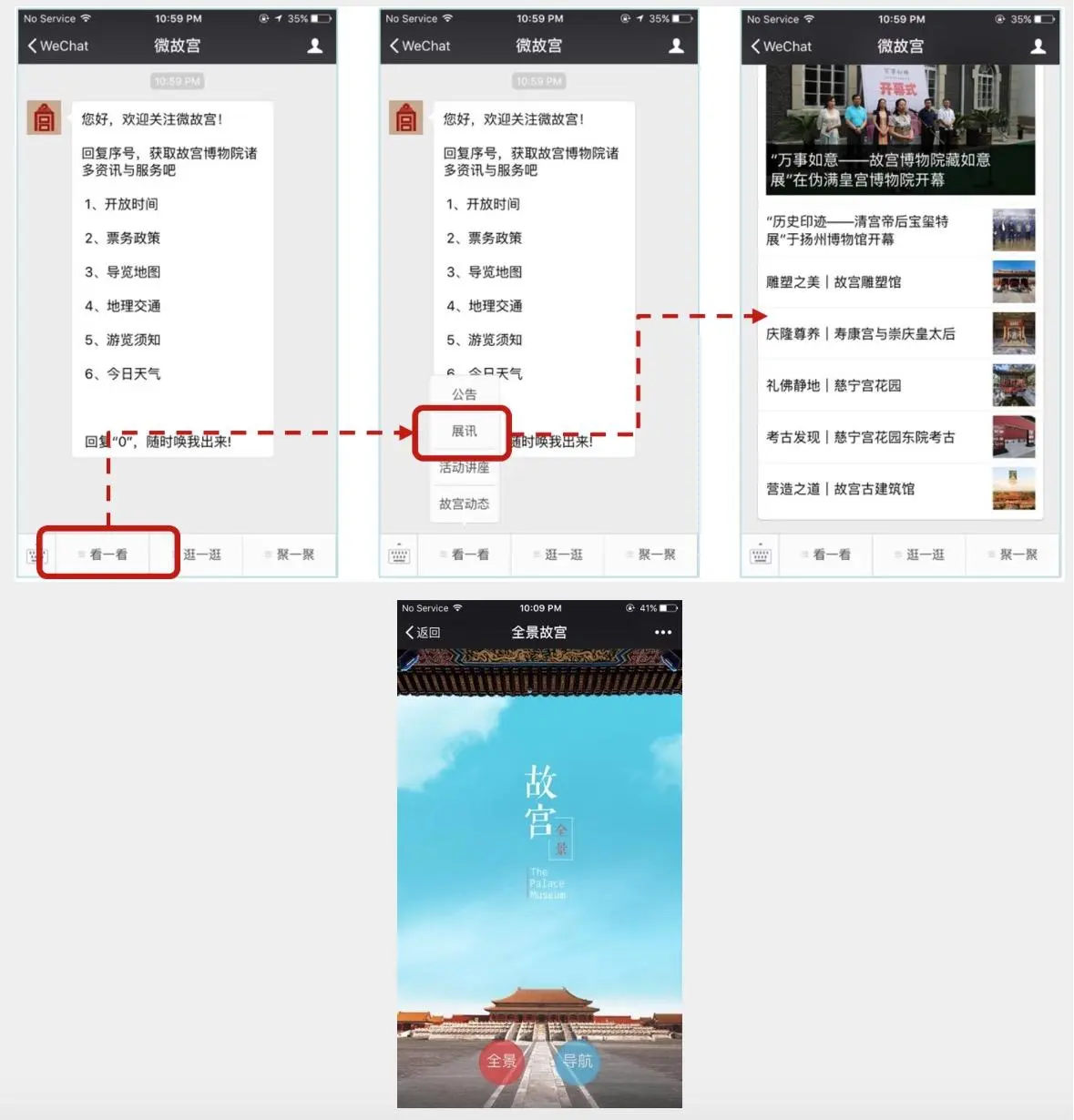 故宫博物院公众号: 用户可以在页面底部选择标签,每个标签将代开一个子菜单,其中的一个菜单将打开关于故宫的一个文章列表,另外一个菜单将打开一个为故宫设计的微信网页。( 然而,通过手机浏览器打开的故宫网站并没有针对移动端优化。)