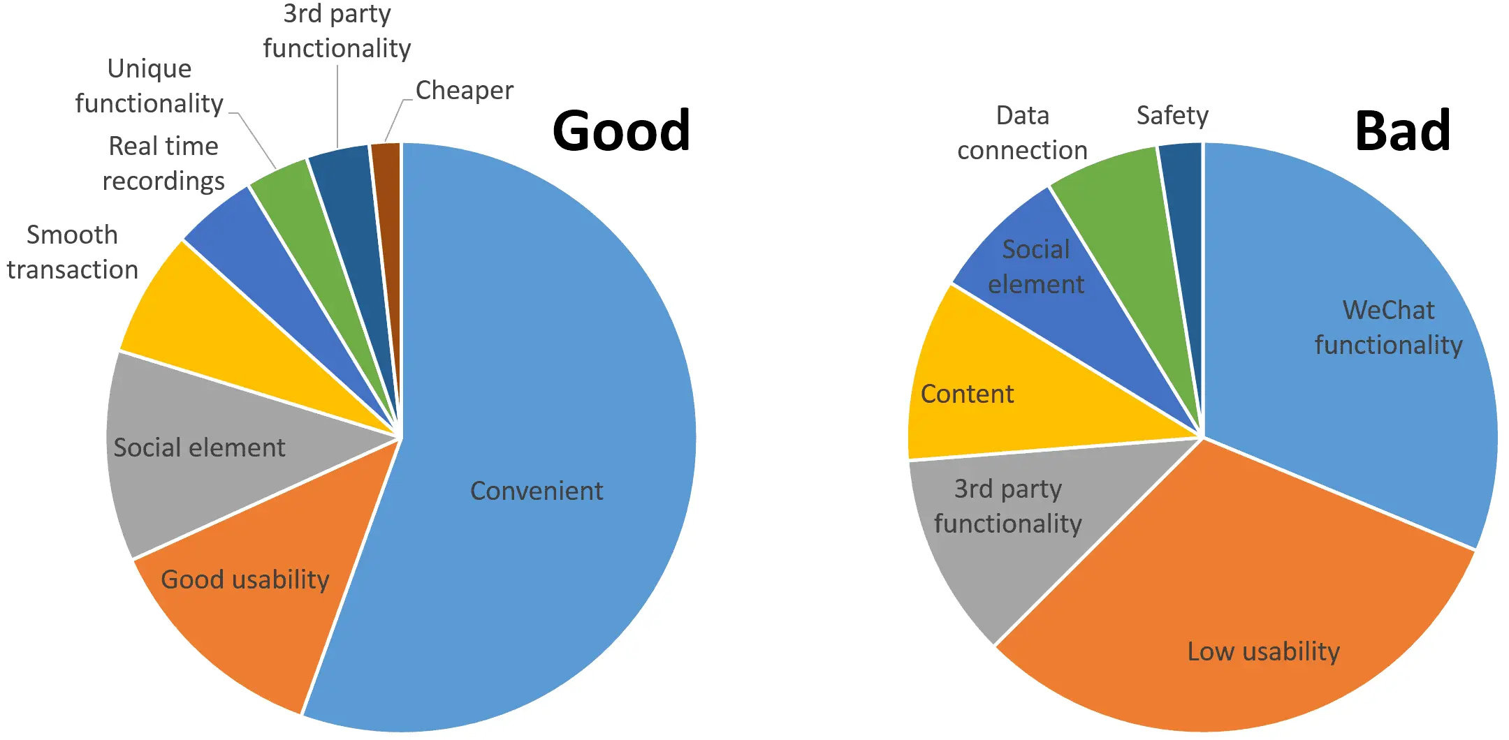 针对微信可用性的不同方面,参与调研的一部分人将其视为一个主要的优势(紧随便利性之后),当然也有人将其视为微信不好的一面。针对可用性,其实没有哪一个用户界面能是完全没有毛病的或者完全一无是处的,虽然微信的界面设计中有许多好的地方,但仍然存在一些肯定需要提升的地方。