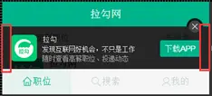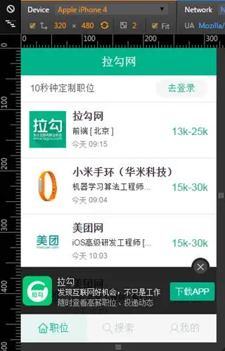 这个规则是一套基本的适配规则,对于这种简单app来说已经足够,同时它也是后面要说的rem布局的基础。另外对于拉勾这种app可能需要额外媒介查询对布局进行调整的就是小屏幕设备。举例来说,因为现在很多设计稿是根据iphone6的尺寸来的,而iphon6设备宽的逻辑的像素是375px,而iphone4的逻辑像素是320个像素,所以如果你根据设计稿做出来的东西,在iphone4里面可能显示不下,比如说拉钩网底部那个下载框,你对比看下就知道了,这是4: