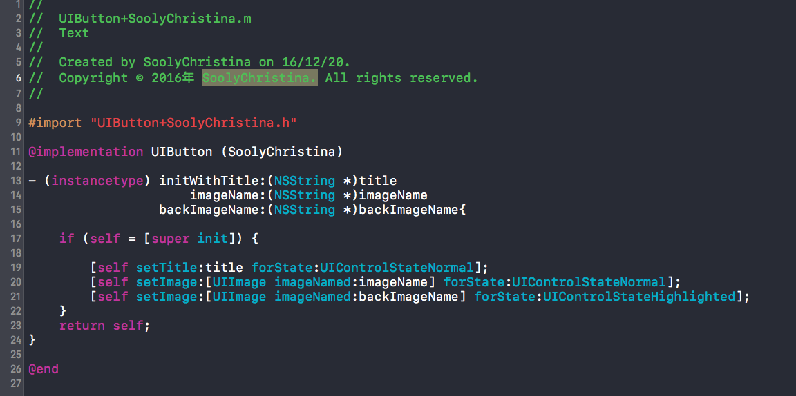 extension UIButton { /// 快速创建按钮 /// - parameter title: title /// - parameter imageName: imageName /// - parameter backImageName: backImageName /// /// - returns: UIButton convenience init(title: String, imageName: String, backImageName: String) { self.init() setTitle(title, for: .normal) setImage(UIImage(named: imageName), forState: .Normal) setImage(UIImage(named: imageName + "_highlighted"), forState: .Highlighted) setBackgroundImage(UIImage(named: backImageName), forState: .Normal) setBackgroundImage(UIImage(named: backImageName + "_highlighted"), forState: .Highlighted) } }注意:便利构造器必须先调用