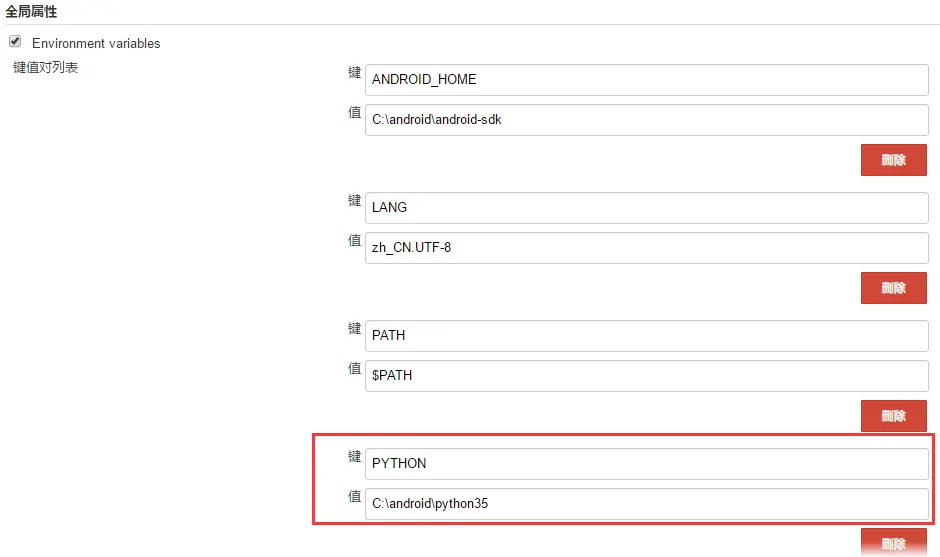 添加python的环境变量到Jenkins的环境变量中,文章前面有提到过,在系统管理->系统设置中,如图添加python环境变量: