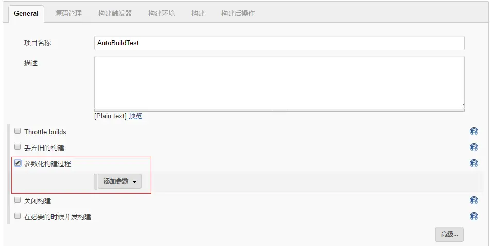 在Jenkins项目主页选择配置,进入配置页,在General tab将参数化构建过程选中,如图: