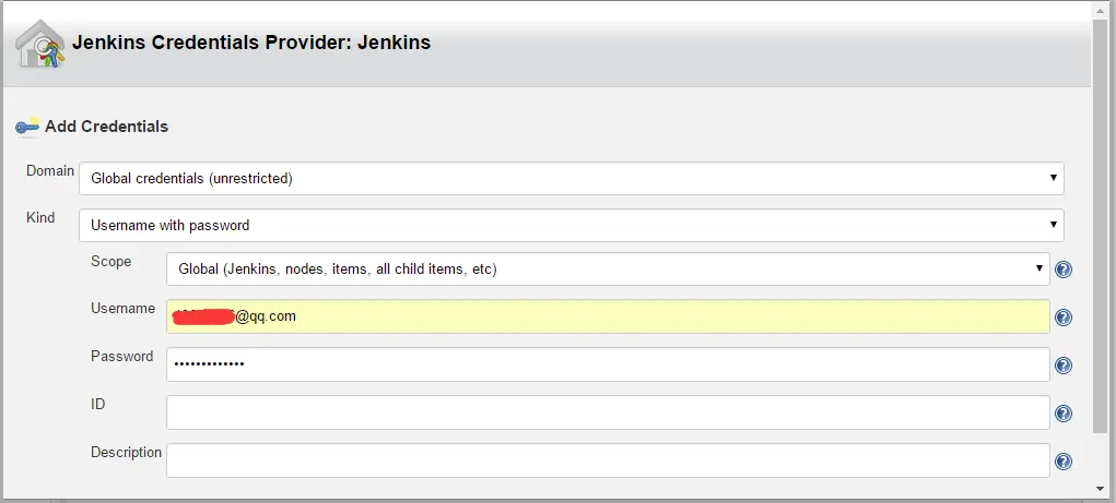 Kind种类选择默认的Username with password,然后在Username和Pasword处分别输入Git账户的用户名和密码,然后滚动到下方点击Add,然后在Credentials中选择我们刚才添加的通行证。