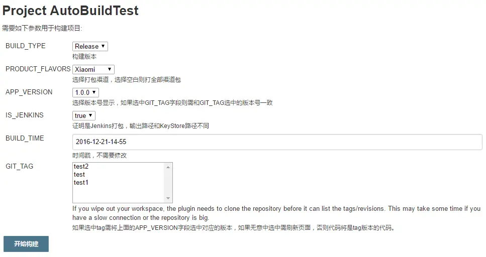 在我们项目中需要配置的选项有:版本(Release 或 Debug),版本号,渠道包,根据Tag打包。另外我们还需要加上打包途径,AS打包还是Jenkins打的包,还要加一个时间戳。所有的参数列出来了,下面就配置Jenkins的参数化构建吧~