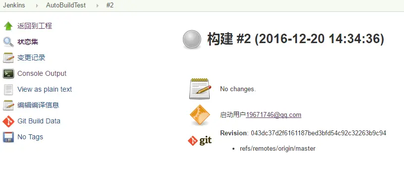 又很多菜单可以选择来查看状态,点击Console Output来查看构建输出的日志,所有的信息都会显示,日志最后输出Finished: SUCCESS即构建成功。