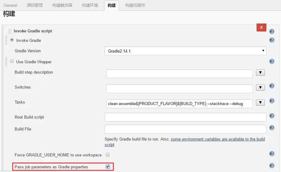 看了图大家肯定留意到了红色框内的选项而且很好奇吧,这个选项是APP_VERSION、IS_JENKINS、BUILD_TIME需要用到的,因为这三个参数需要注入到Android项目中的配置一样,而红色框中的这个选项可以帮我们侵入到gradle.properties文件中替换值,并且build.gradle文件能够直接引用gradle.properties文件中的属性,所以起到了侵入的效果。下面分别是我的gradle.properties和主项目的build.gradle文件全代码: