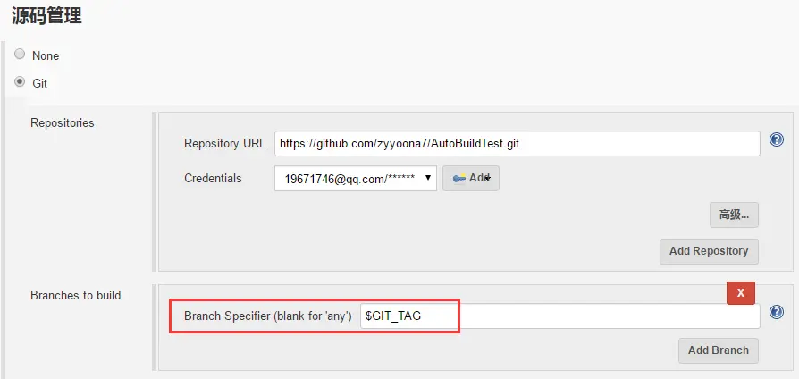 GIT_TAG参数使用配置,只需在源码管理处的Branch引用改为$GIT_TAG引用参数名,如图: