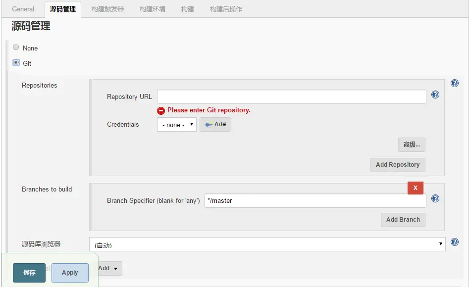 选中Git选项,会出现上图的界面,配置Git项目的URL,我测试用的是Github项目,并且传输协议选择的是HTTP,需要选择Credentials选项,选择通行证,第一次需要点击Add添加通行证,如图: