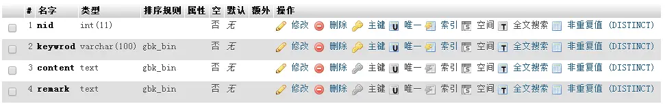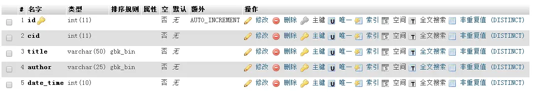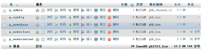 主要有5个数据表:全站配置表p_config、后台会员表p_admin、新闻分类表p_newsclass、新闻标题表p_newsbase、新闻内容表p_newscontent,如下图所示: