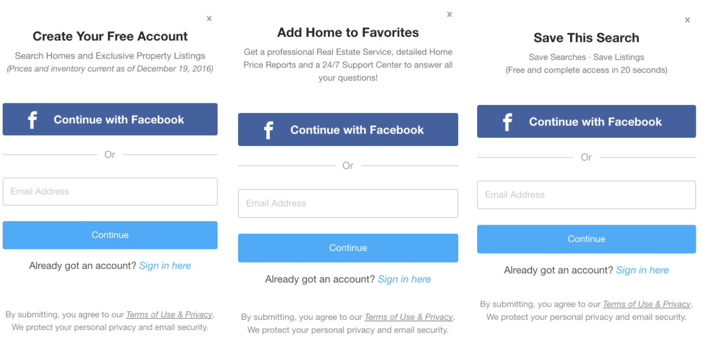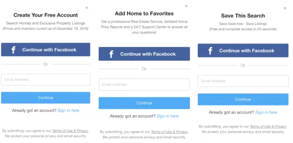 在上面的弹框的触发机制分别是:用户点击了注册、点击了收藏房源、点击了保存搜索条件。如果用户没有登陆就会弹一个注册框,当用户注册完之后,要继续执行用户原本的操作,例如该收藏还是收藏,所以必须要有一个注册后的回调,并且这个回调做的事情还不一样。