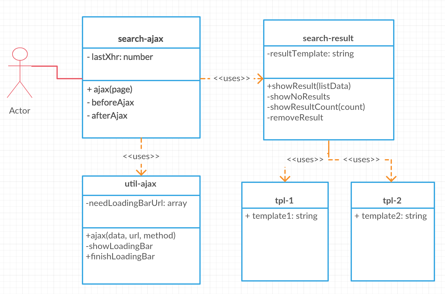 再往下,会发现,在显示结果那里,即上面代码的第7行,需要对有结果、无结果的情况分别处理,所以又搞了一个函数叫做showResult,这个函数有点大,它里面的逻辑也比较复杂,有结果的时候除了更新列表结果,还要更新结果总数、更新分页的状态。因此这个showResult一个函数难以担当大任。所以把这个show-result也当独分离出一个模块,负责结果的处理。