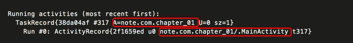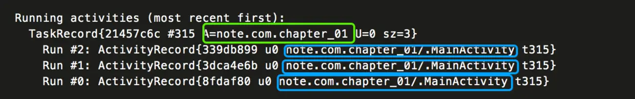 可以看出此时只有一个任务栈,任务栈为当前包名,任务栈中有3个MainActivity(原本的一个MainActivity和启动两次) -
