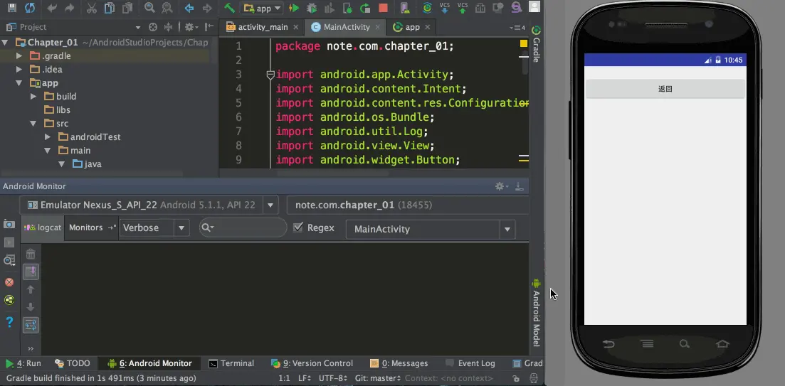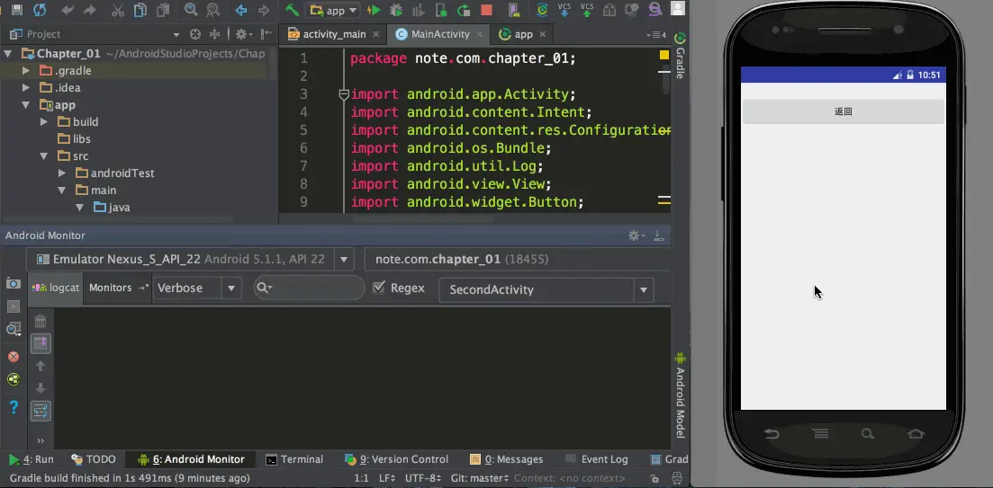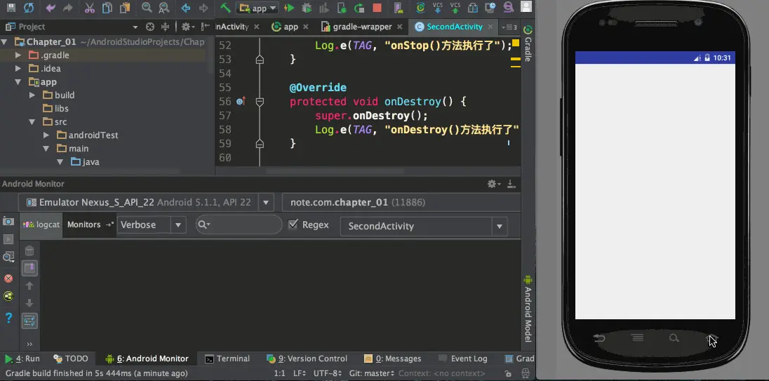 (4)当用户按back键回退时,回调方法如下:onPause->onStop->onDestroy