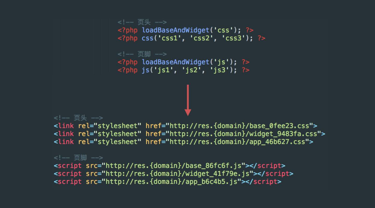 style 也是一样的。刚才说完了基础层和组件层,我们再看看业务层。比如我用PHP 的方法,然后我们弄成这样,一个逗号在中间,把他们打包在一起生成一个。我们下面会传进去,然后加上业务代码加载,我们最后生成出来是这样的,比如说这里有 base,这里有 widget,这里有 App。
