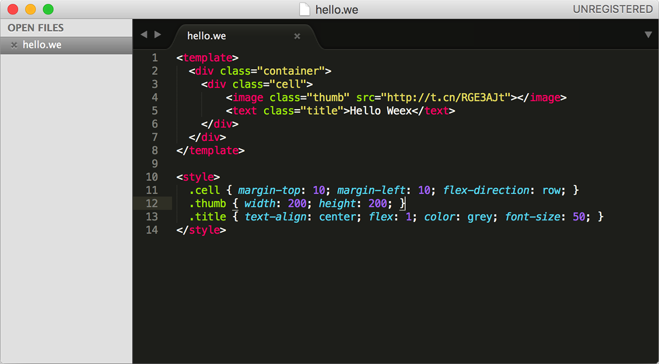 新建一个文本文件(位置随意),命名为 hello.we (.we 是 weex 源代码的文件格式),并将如下内容复制到该文件中: