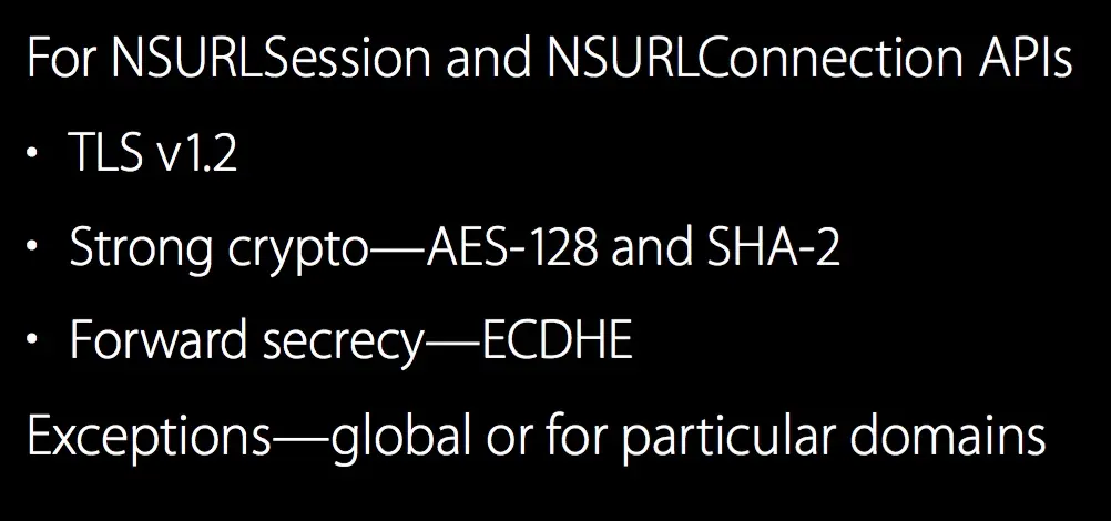 苹果在 WWDC 2016 上宣布:2016 年底将要求所有 APP 适配苹果的 App Transport Security,简单地说就是除了特殊情况(浏览器、第三方服务、媒体)外,APP 跟服务端的通信必须使用 HTTPS 协议,否则 iOS 9 和 macOS 10.11 起,操作系统将有能力阻止所有的明文 HTTP 请求。在上面的 session 中,苹果还对具体的细节做出了要求。不过,就在今天,苹果宣布将这个 deadline 无限期推迟。