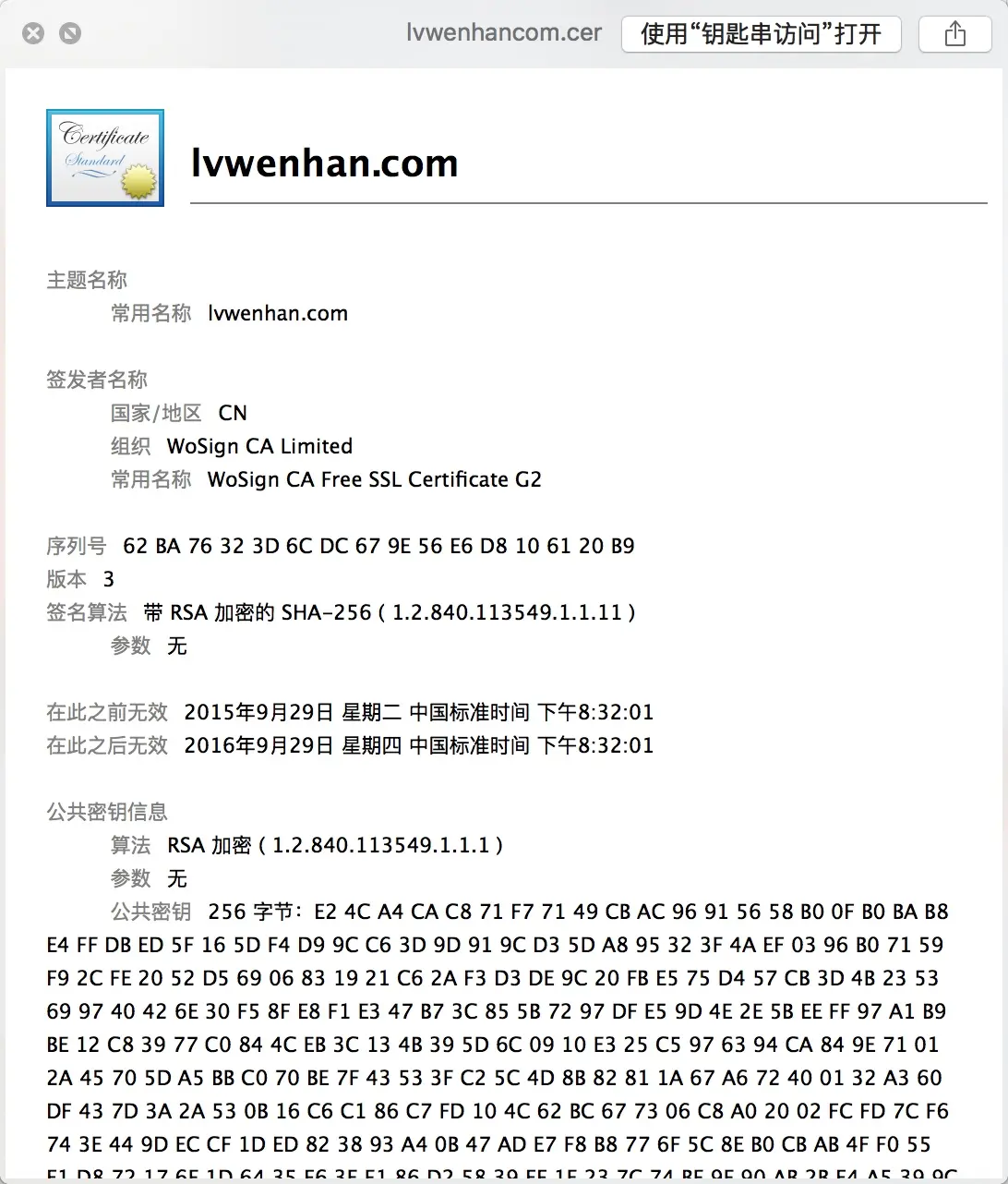 -----BEGIN CERTIFICATE-----MIIErzCCA5egAwIBAgIQYrp2Mj1s3GeeVubYEGEguTANBgkqhkiG9w0BAQsFADBVMQswCQYDVQQGEwJDTjEaMBgGA1UEChMRV29TaWduIENBIExpbWl0ZWQxKjAoBgNVBAMTIVdvU2lnbiBDQSBGcmVlIFNTTCBDZXJ0aWZpY2F0ZSBHMjAeFw0xNTA5MjkxMjMyMDFaFw0xNjA5MjkxMjMyMDFaMBcxFTATBgNVBAMMDGx2d2VuaGFuLmNvbTCCASIwDQYJKoZIhvcNAQEBBQADggEPADCCAQoCggEBAOJMpMrIcfdxScuslpFWWLAPsLq45P/b7V8WXfTZnMY9nZGc012olTI/Su8DlrBxWfks/iBS1WkGgxkhxirz096cIPvlddRXyz1LI1Npl0BCbjD1j+jx40e3PIVbcpff5Z1OLlvu/5ehub4SyDl3wIRM6zwTSzldbAkQ4yXFl2OUyoSecQEqRXBdpbvAcL5/Q1M/wlxNi4KBGmemckABMqNg30N9OipTCxbGwYbH/RBMYrxncwbIoCAC/P189nQ+RJ3szx3tgjiTpAtHref4uHdvXI6wy6tP8FXh2HIXbx1kNfY+8YbSWDnvHiN8dL+fkKsr5KU5nNG54KGkdOdlljkCAwEAAaOCAbcwggGzMAsGA1UdDwQEAwIFoDAdBgNVHSUEFjAUBggrBgEFBQcDAgYIKwYBBQUHAwEwCQYDVR0TBAIwADAdBgNVHQ4EFgQUkjyOi+6xj5KkgATKLXS12K9xSvMwHwYDVR0jBBgwFoAU0qcWIHyv2ZWe60MKGfLguXQOqMcwfQYIKwYBBQUHAQEEcTBvMDQGCCsGAQUFBzABhihodHRwOi8vb2NzcDEud29zaWduLmNvbS9jYTYvc2VydmVyMS9mcmVlMDcGCCsGAQUFBzAChitodHRwOi8vYWlhMS53b3NpZ24uY29tL2NhNi5zZXJ2ZXIxLmZyZWUuY2VyMD0GA1UdHwQ2MDQwMqAwoC6GLGh0dHA6Ly9jcmxzMS53b3NpZ24uY29tL2NhNi1zZXJ2ZXIxLWZyZWUuY3JsMCkGA1UdEQQiMCCCDGx2d2VuaGFuLmNvbYIQd3d3Lmx2d2VuaGFuLmNvbTBRBgNVHSAESjBIMAgGBmeBDAECATA8Bg0rBgEEAYKbUQYBAgIBMCswKQYIKwYBBQUHAgEWHWh0dHA6Ly93d3cud29zaWduLmNvbS9wb2xpY3kvMA0GCSqGSIb3DQEBCwUAA4IBAQApspu1V2KlscwQints4zqm6xnfoXkjZJjaanXmbOER8iRd1hmzN6vRYcOJ2t0QmkjBisRgi4ffJVZ9QF30LzmaZYg+PQUX15CxDlG9XTRB6ufqdlsGdc44NqGdHuo8uIsko1MjubS8mQw7ClLc4VEvP2KUBZFgaenfG6Y8v5DWWV+NfiCkmCMFXu6nbqEvEf+ev3arnaQSiDhH98Y+ivysKu8aYlsb2VsRaF8e9bMvE2PgfZCg93lSou/vQS1VUED7ih5lLb2CQqW8ksMpXKK1E/BNFR7GR8i1NfL15KdIGUmsklT60vooRd7zM9ai8vtmkg9xykwpgUPbTjcdmRAb-----END CERTIFICATE-----