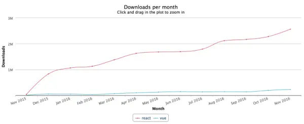 毫无疑问,React是目前最受欢迎的前端框架。它在NPM上每个月的下载量超过了250万次,相比之下,Vue是22.5万次。