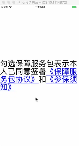 主流方式就是当前大部分基于CoreText封装的富文本展示类(包括TTTAttributedLabel、NIAttributedLabel和FTCoreTextView)中使用的方法 CTLineGetStringIndexForPosition。这个方法是获取当前点在所在文字处于当前绘制文本的索引值。事实上如果没有一些其他因素的话,能使用这个方法是最简便快捷的。然而老司机为什么没有使用这个方法去获取点击事件呢?请看下面的动图👇