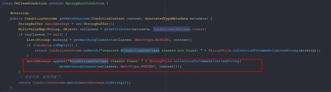 源码中的方法主要是是将 @ConditionalOnClass 的参数中对应的类进行查询和匹配。