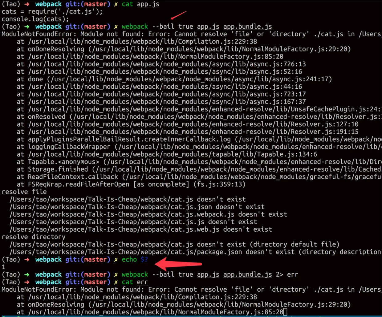 可以看到, 使用 bail 参数并传递 true 进去, 在遇到错误的时候,打包过程将会退出, return code 为 1 且把错误信息打印到 stderr .