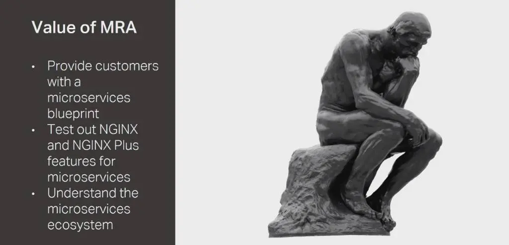 我们建立这个参考架构是因为我们需要给我们的客户提供构建微服务的蓝图,我们也想在微服务上下文中测试Nginx和Nginx Plus的功能,弄清楚如何才能更好地利用它的优势。最后,我们要确保我们对于微服务生态系统以及其可以给我们提供什么有一个深入的理解。