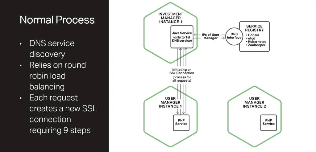 在这个图中,你可以看到投资管理器需要跟用户管理器通讯来获取信息。投资管理器创建了一个HTTP客户端,该客户端针对服务注册中心发起了一个DNS请求并获得返回的一个IP地址,接着初始化了一个到用户管理器的SSL/TLS连接,该连接需要通过九阶段的协商或者是”握手”过程。一旦数据传输完毕,虚拟机会关闭连接并进行HTTP客户端的垃圾回收。