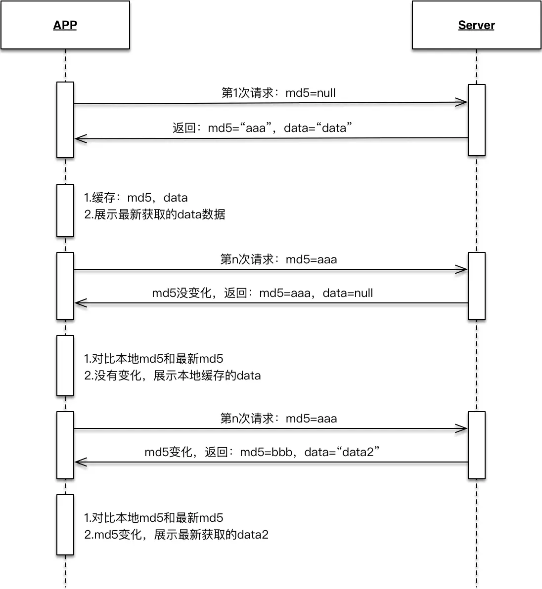 如果1.0的接口A存在md5缓存,正常都是后端上线后再发布1.1客户端的顺序,如果在后端上线后,1.1还没发布的情况下,此时1.0的客户端就缓存了1.1后端逻辑的md5,在更新成1.1的时候,md5没有变,就有可能缓存的还是1.0的数据,所以比较推荐后端在计算md5的时候把version加上,这样更新APP可以保证md5是不一样的。