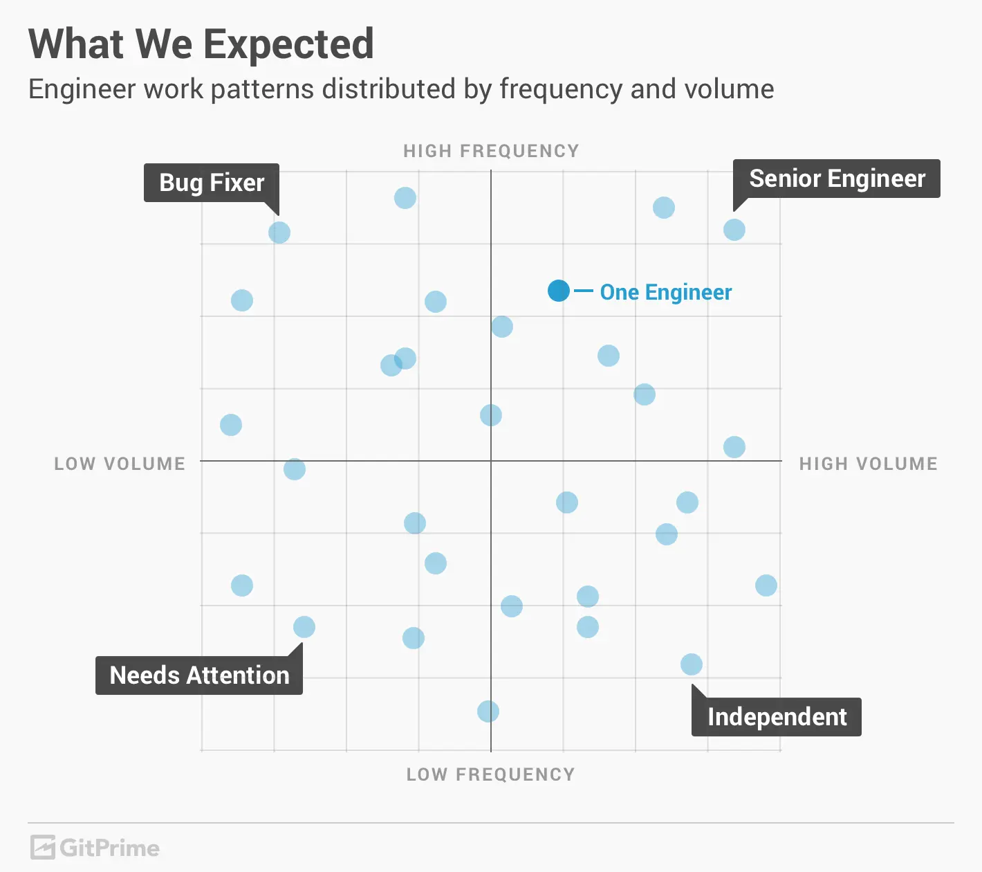 要探讨这个,我们得先假设团队里有的工程师易于快速切换工作,其他人则更喜欢一次搞定大量工作。如果假设成立,我们可以用频率和工作量这两个轴画出工程师的分布,就像这样: