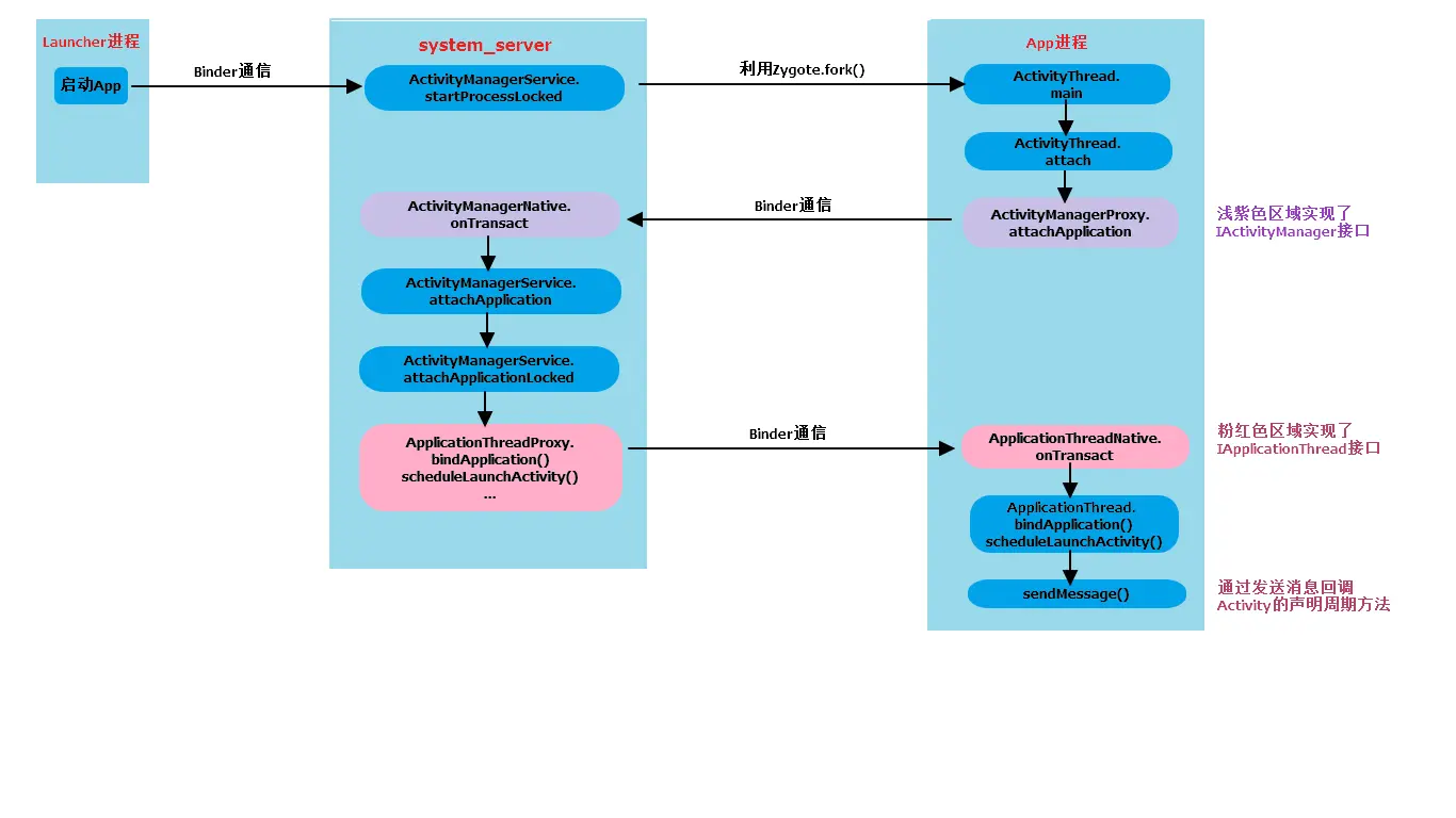 在app进程中,main方法会实例化ActivityThread,同时创建ApplicationThread,Looper,Hander对象,调用attach方法进行Binder通信,looper启动循环。attach方法内部获取ActivityManagerProxy对象,其实现了IActivityManager接口,作为客户端调用attachApplication(mAppThread)方法,将thread信息告知AMS。