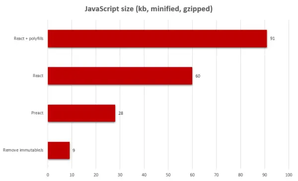下面是应用+React+polyfill的大小、去掉polyfill的大小、使用 Preact 后大小的对比: