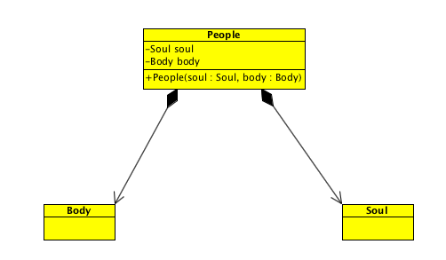 人和灵魂,身体之间是组合关系,当人的生命周期开始时,必须同时拥有灵魂和肉体,当人的生命周期结束时,灵魂肉体随之消亡;无论是灵魂还是肉体,都不能单独存在,他们必须作为人的组成部分存在。