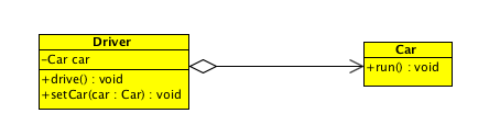 - 车是一辆私家车,是司机财产的一部分,强调的是人财产的部分性,则相同的代码即可表示聚合关系。