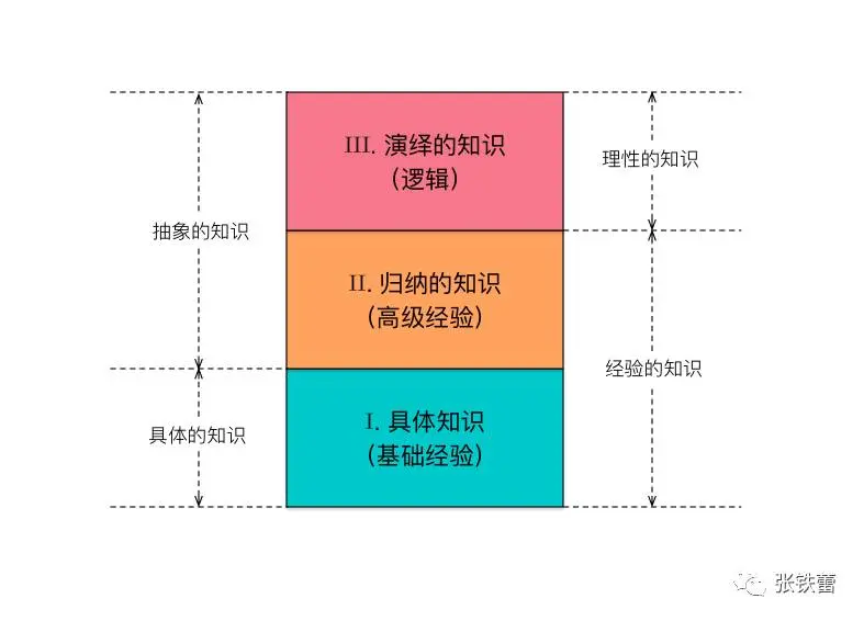 上面对于知识的分类,我们还有另外一种划分方式:第I类是“具体的知识”,而第II、III两类都属于“抽象的知识”。从具体到抽象,是人类智能的核心能力之一。这在哲学上的体现,初级的形式就是对于共相问题的探讨;而更高级的形式,则是对于归纳法、因果律的认识。