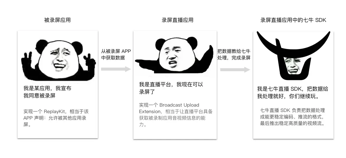 ReplayKit 是苹果 iOS 10 以上版本提供的用于录屏并对外直播的功能。简单而言就是苹果通过这个功能把采集到的屏幕视频信息和音频信息回调给开发者,开发者可以任意处理这些信息。但是问题是,ReplayKit 使用上限制较多,首先要求系统必须为 iOS 10 以上;其次,被录屏的 App 必须支持 ReplayKit 功能。这也很容易理解,毕竟录屏是比较敏感的行为。所以必须游戏本身支持,以表示被录制方已经同意录屏。熊猫 TV 作为国内首家支持 ReplayKit Live 的直播平台,开创了直播行业的先河。熊猫 TV iOS 上的录屏方案采用七牛提供的 ReplayKit 方案实现。