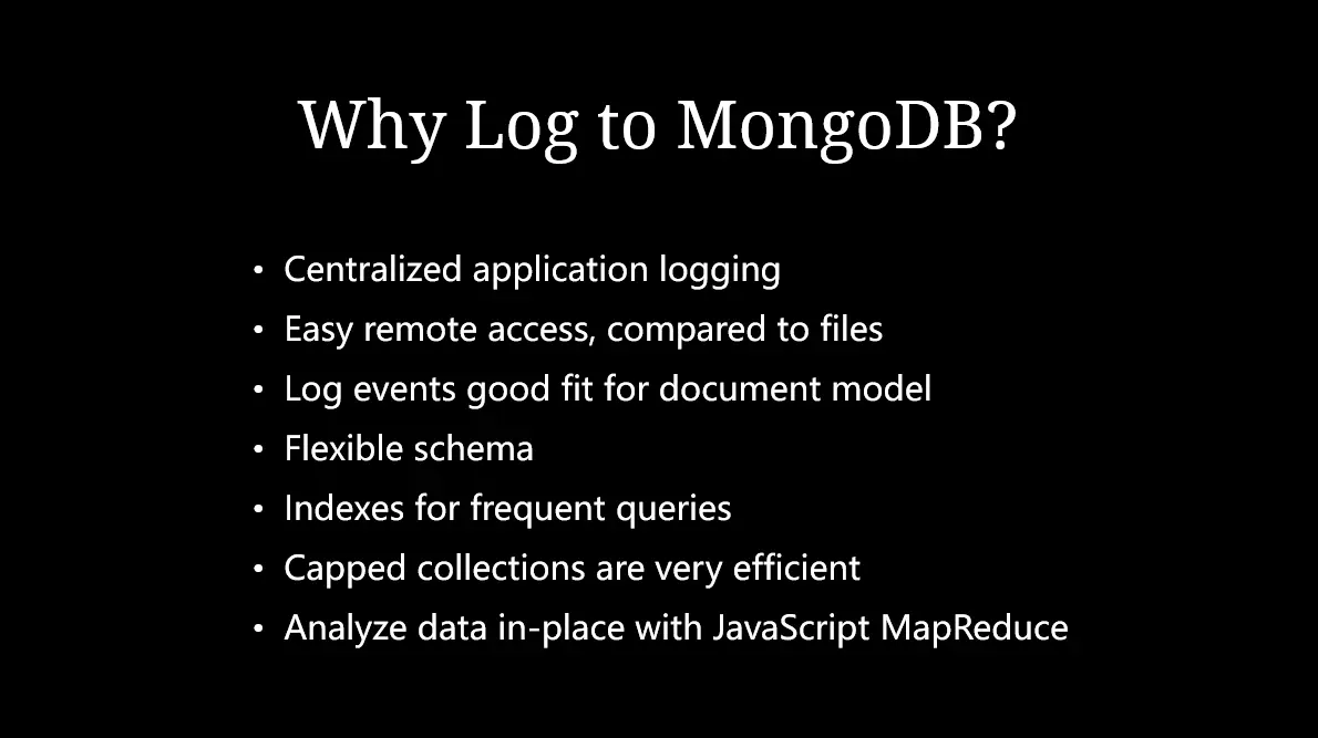 服务器的日常运维通常会产生大量的日志信息(如错误、警告和用户行为),这些日志信息通常是以文本格式存储于服务器本机的日志文件中。文本格式的日志虽然具有很好的可读性,但每次都要打开服务器本机查看,使用和分析日志比较麻烦,再结合当今微服务架构的潮流,基于本机日志文件的日志存储方式也会给开发和运维带来不少的附加的、可避免的工作量,将日志存储于数据库会可以让使用和分析日志的更加高效。MongoDB性能高,易于扩展,且schama freeness,将日志存储于 MongoDB 非常合适,有不少开发者和企业都把日志存储于MongoDB中。