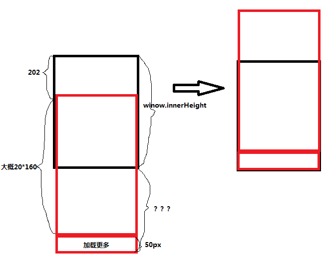 这里首次加载是20行数据,每一行高度大概160,主意是大概, window.innerHeight是视窗的高度,202px是滚动的容器的padding top的值,50px是用来留给显示加载更多的...