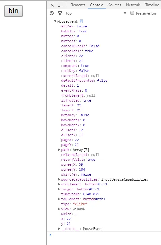 这时控制台打印了一个 MouseEvent 对象,这个稍微解释一点: