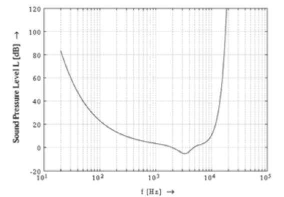 声音信号在空气中传播,呈现的是时间幅度信号。另外,人耳听到的声音可以从频域上进行区分,如常见的低音炮、男中音、女高音,都是指不同频率。人耳对于不同频率的感知敏感度不一致,经过人们长期研究发现,如上图所示,横轴为人耳感知的频率,纵轴为不同频率的声音响度,也可以通过以下公式得到: