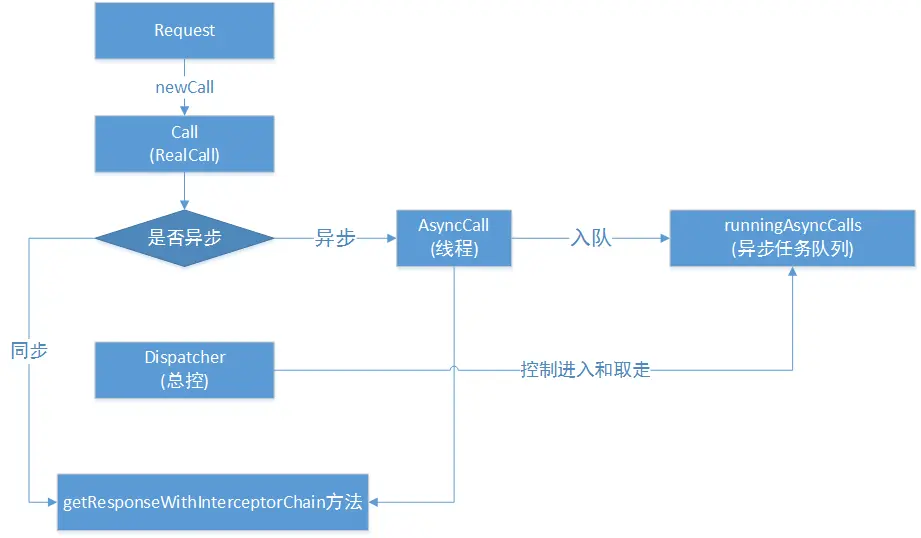 异步执行是通过Call.enqueue(Callback responseCallback)来执行,在Dispatcher中添加一个封装了Callback的Call的匿名内部类Runnable来执行当前 的Call。这里一定要注意的地方这个AsyncCall是Call的匿名内部类。AsyncCall的execute方法仍然会回调到Call的 getResponseWithInterceptorChain方法来完成请求,同时将返回数据或者状态通过Callback来完成。
